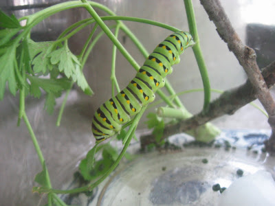 Few weeks ago I found this FAT caterpillar on my parsley. I brought her in and gave her some wet cotton balls, twigs and some more parsley. We watched her everyday. She stopped moving one day, Jennifer thought she was dead because she wasn't moving anymore. Then we noticed a shell covering happening. We watched for about 2 weeks, turning brown. Like the branch it was on. Then for some reason I had to look at the jar today. She just came out!!! Her wings were not opened yet. We watched her flap her wings and rest. Of course we took her out right away, and helped her to the grass. She sat there a few minutes. Then flew off into the trees.